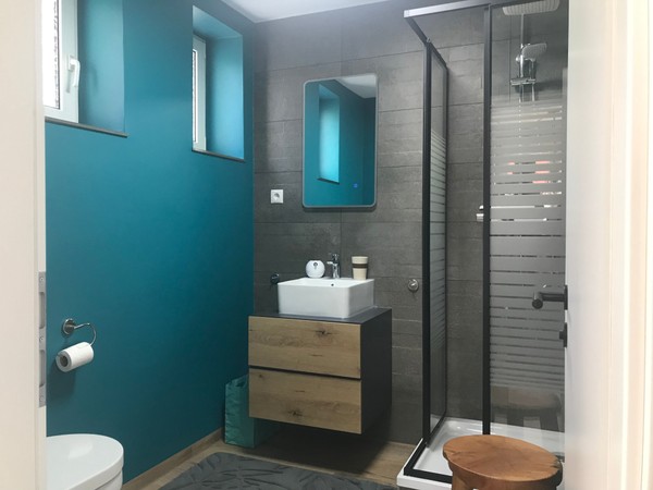 Genießen Sie modernen Komfort und Entspannung in unserem stilvollen Badezimmer – ein Ort der Erfrischung und Regeneration während Ihres Aufenthalts.